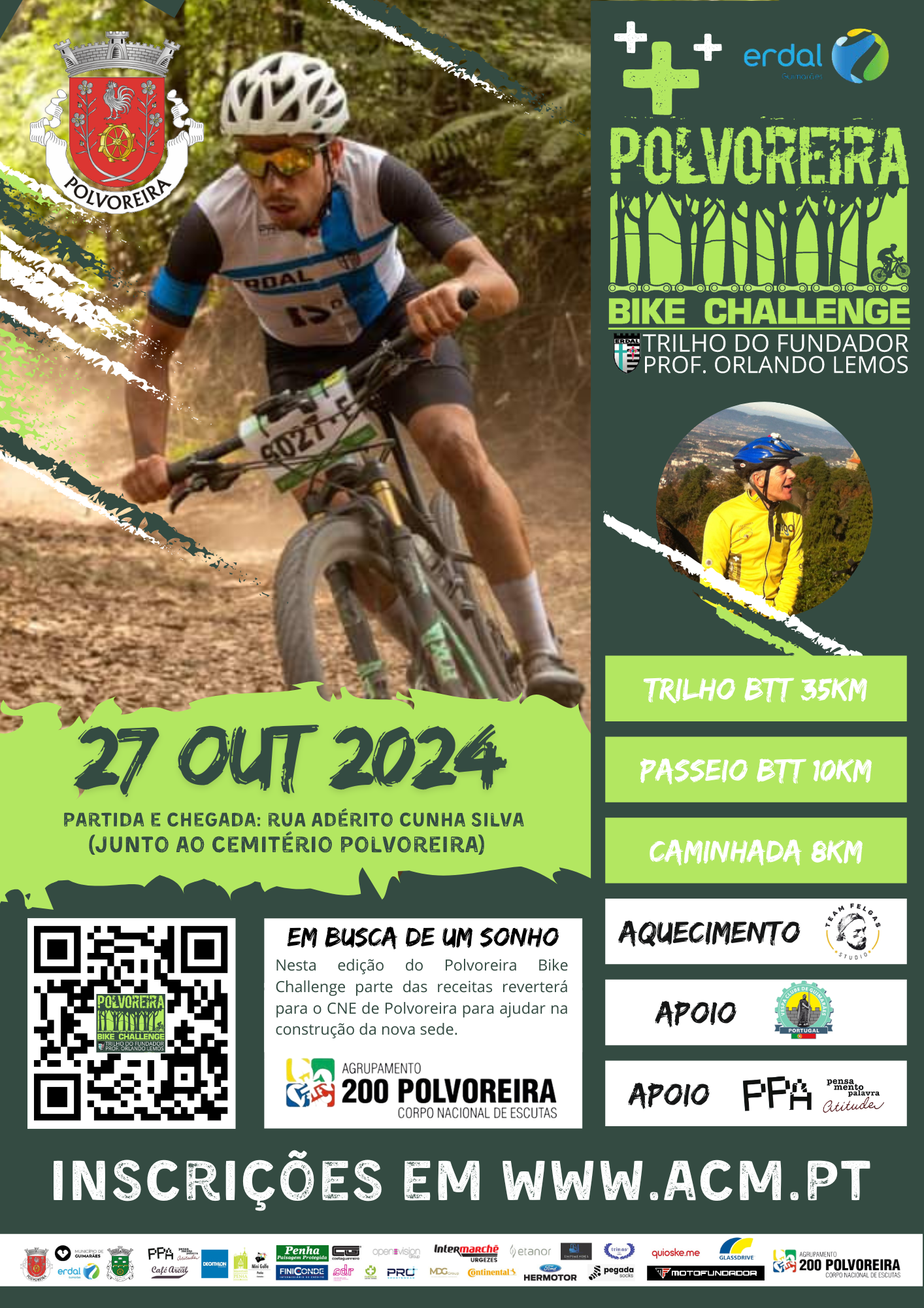A Junta de Freguesia de Polvoreira promove no dia 27 de outubro de 2024, mais uma edição do “Polvoreira Bike Challenge”, em parceria com a Erdal – Escola de Referência Desportos de Ar Livre, nomeadamente com o Trilho do Fundador Professor Orlando Lemos. A iniciativa tem o apoio da Associação de Ciclismo do Minho e as inscrições podem ser feitas online (www.acm.pt).
