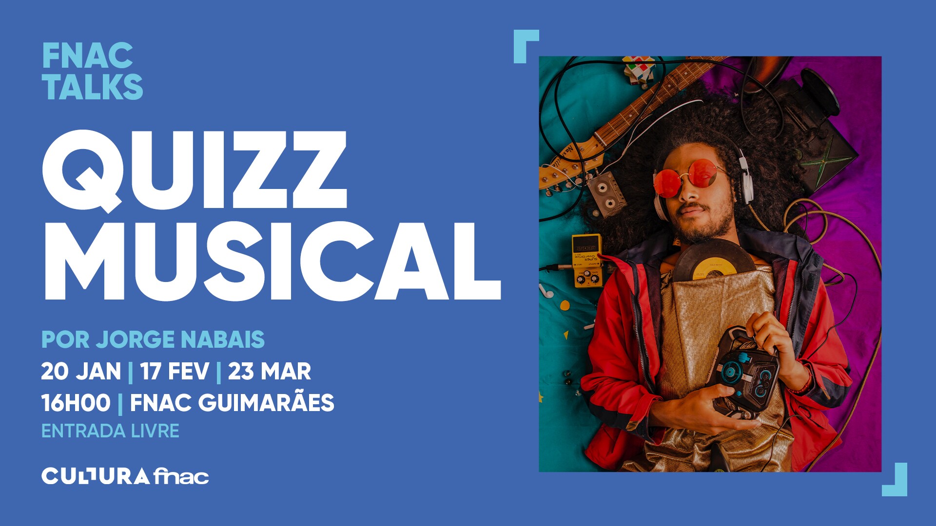 O quiz musical a realizar na FNAC Guimarães, pelo host Jorge Nabais, é uma atividade divertida para os amantes da música e curiosos em geral. O evento consiste num quiz em que os participantes irão testar os seus conhecimentos musicais, respondendo a perguntas sobre artistas, álbuns, letras de música e curiosidades relacionadas com o mundo da música.