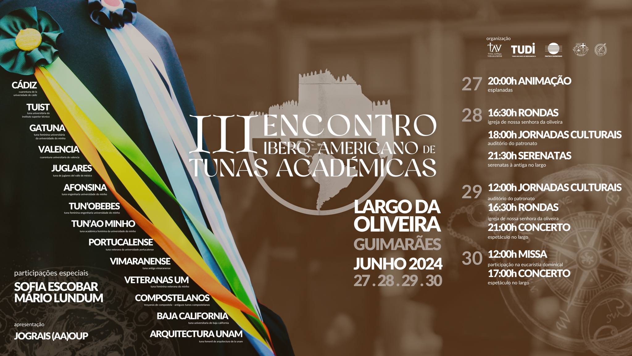 Guimarães receberá pela 3ª vez o Encontro Ibero-Americano de Tunas Académicas (EITA), um evento que transcende os habituais Encontros de Tunas para se afirmar como uma festa cultural única. O intercâmbio envolve tunas de academias de Portugal (Lisboa, Porto e Minho), Espanha (Santiago de Compostela, Cádiz e Valência) e do continente americano (Tijuana e Cidade do México). Organizado pelas tunas vimaranenses em parceria com a Associação Tunos Decanos de Iberoamérica, o evento promete animar a cidade durante 4 dias, com mais de 400 tunos participantes.