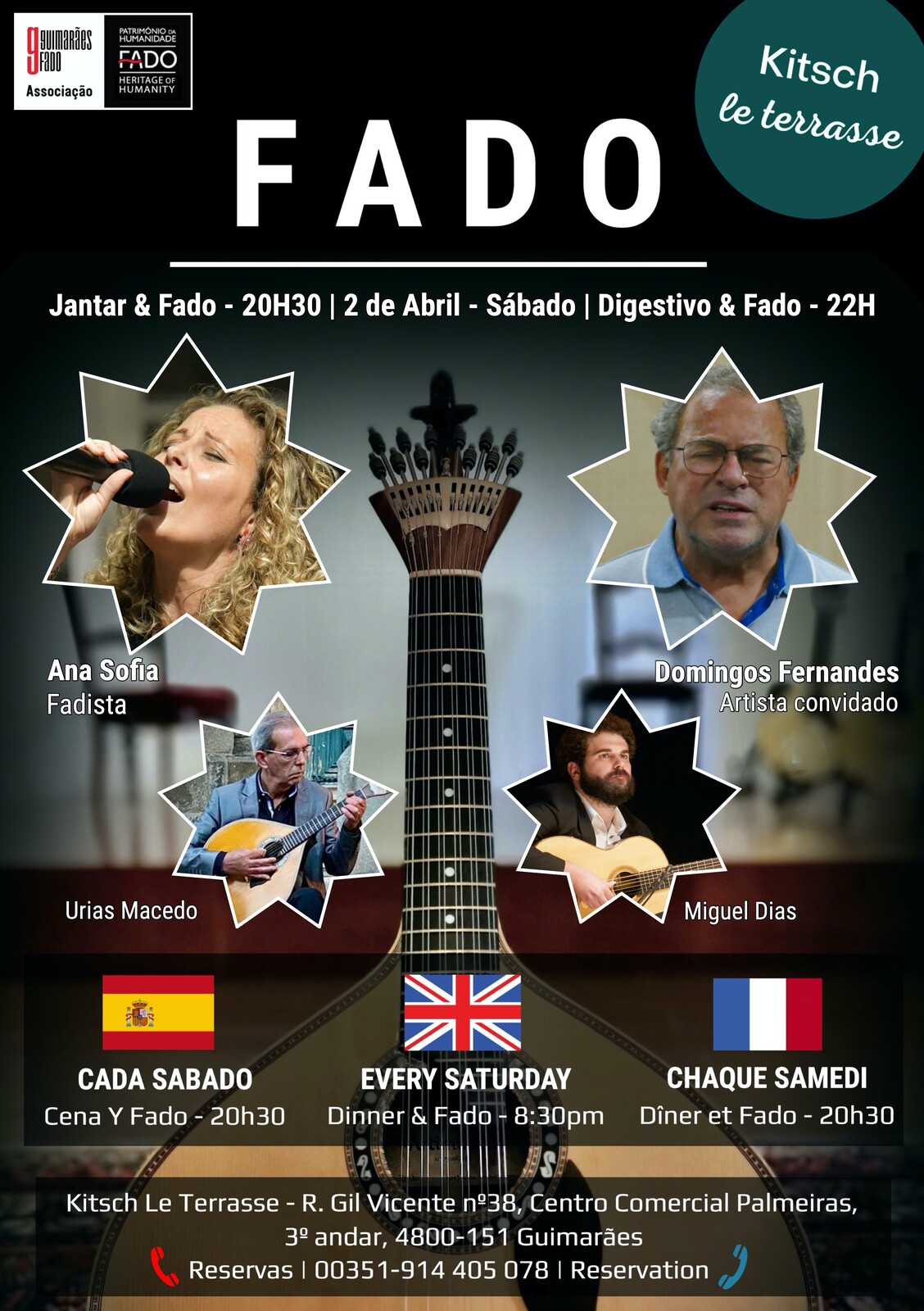 Numa oferta regular (todos os Sábados) de raiz cultural e gastronómica sob o domínio da exigência e qualidade, espelhando o bem fazer e o bem receber das nossas gentes, a Associação Guimarães Fado implementa deste modo, uma solícita divulgação da canção Património Imaterial de Humanidade, o Fado, com particular enfase na excelência do elenco artístico, com recurso – sempre que oportuno – aos mais relevantes artistas locais. E a Canção de Coimbra também estará presente nos mesmo moldes. Dando enfoque ao assinalável turismo cultural, cada vez mais em busca da pitoresca e deleitosa Cidade de Guimarães, esta iniciativa – porém - não negligencia sócios, simpatizantes e aficionados locais; neste sentido se por um lado após as 22H é possível assistir ao espetáculo sem jantar, por outro acautelamos preços especiais para os referidos sócios e simpatizantes locais, que pretendam aceder ao programa completo (Jantar & Fados). É de assinalar igualmente a qualidade gastronómica e acolhimento do Restaurante “Kitsch Le Terrasse”, nosso parceiro nesta iniciativa. Na edição de 2 de Abril 2022, teremos o seguinte elenco artístico: Fadista: Ana Sofia (a mais relevante voz do Fado no panorama Vimaranense) Artista convidado: Domingos Fernandes (Sócio Associação Guimarães Fado) Viola de Fado: Miguel Dias Guitarra Portuguesa (Estilo Lisboa): Urias Macedo Fado Vadio – No final do espetáculo, abre-se um momento à participação dos artistas amadores em sala, numa alternância entre a perspetiva profissional e amadora, tão característica deste género musical.