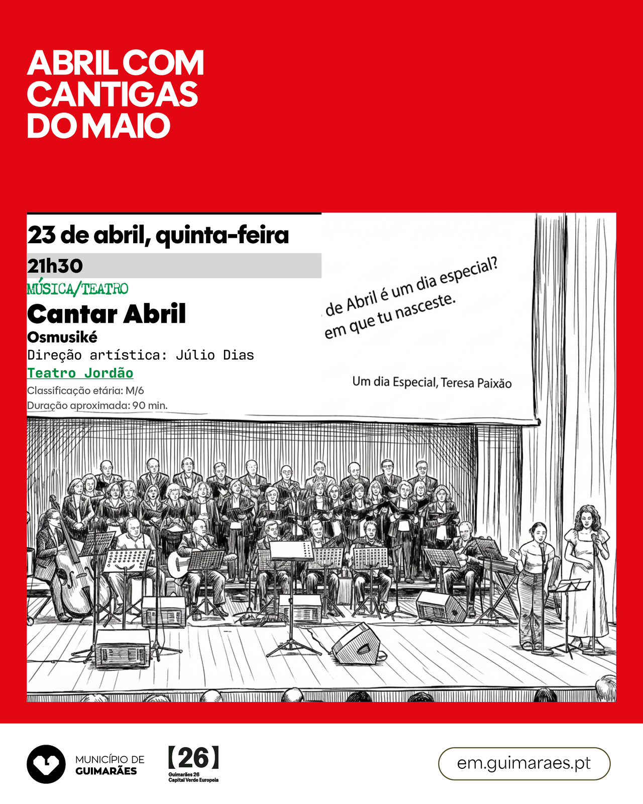 Sinopse: Um espetáculo evocativo e sensorial que atravessa a memória coletiva portuguesa desde a Revolução de 25 de Abril de 1974 até à integração europeia. Entre música, teatro e palavra dita, “Cantar a Liberdade – Dos Cravos às Estrelas” propõe uma viagem emocional pela conquista da liberdade, pela construção da democracia e pela afirmação de Portugal na Europa. Com forte componente cénica e musical, o espetáculo alterna momentos corais, recriações históricas e quadros poéticos, culminando numa celebração coletiva da identidade, da cultura e do futuro sustentável.