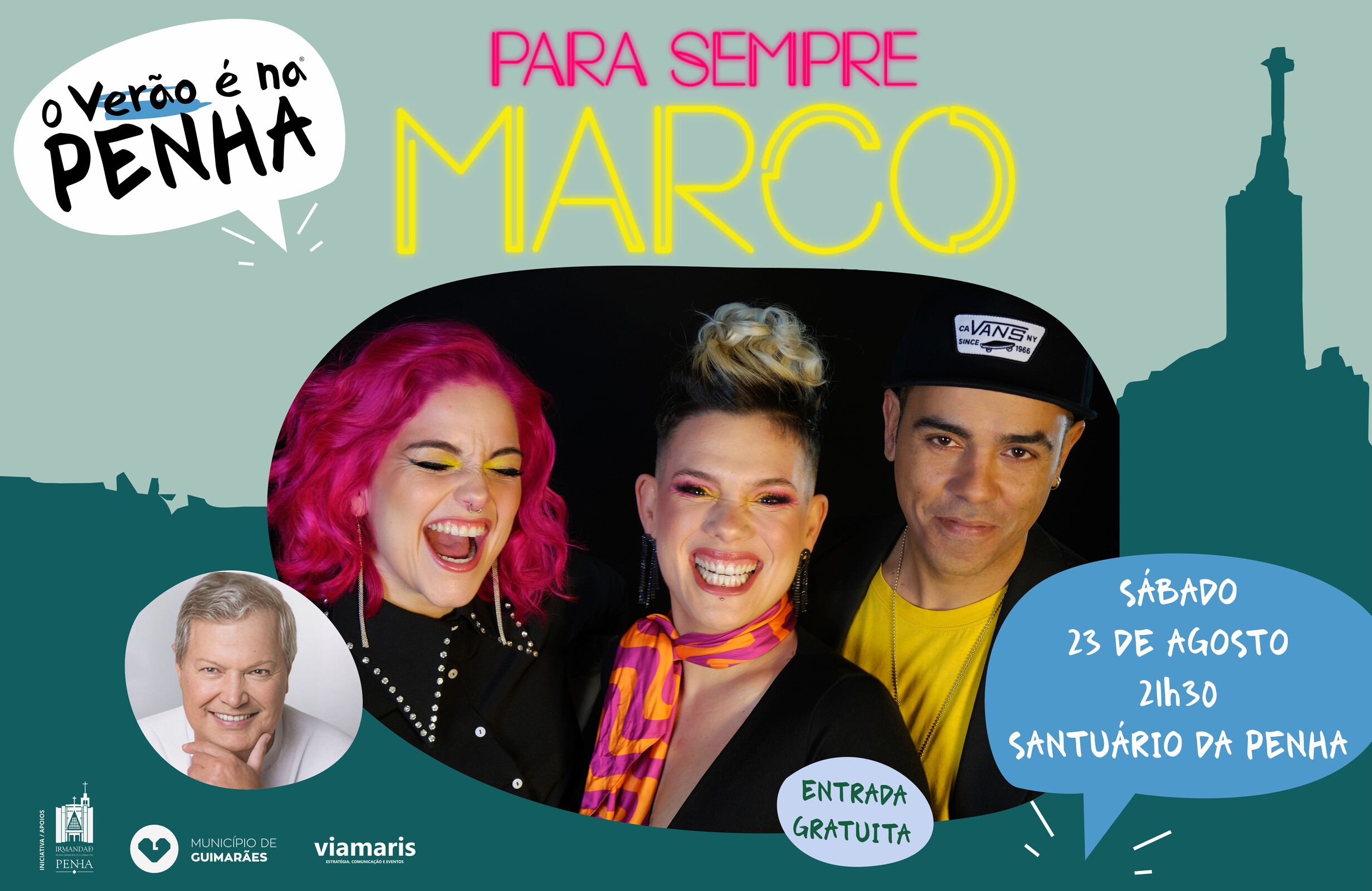 Evento integrado no ciclo "O Verão é na Penha". Para Sempre, Marco No coração da Penha, em pleno recinto do Santuário, ergue-se um palco onde a música se transforma em celebração: “Para Sempre, Marco” é um concerto-homenagem vibrante e imperdível, que presta tributo a um dos maiores ícones da música portuguesa — Marco Paulo. Com direção artística de Tiago Pais Dias (Amor Electro), o espetáculo reinventa os clássicos que marcaram gerações, fundindo-os com sonoridades modernas — do pop ao funk, do rock ao eletrónico — sem nunca perder a alma original. As poderosas e fascinantes vozes de Jéssica Cipriano e Andrea Verdugo (ambas ex-The Voice) dão nova vida a êxitos como “Eu Tenho Dois Amores”, “Taras e Manias”, “Joana”, “Maravilhoso Coração”, "Ninguém, ninguém", "Sempre que brilha o sol" e "Nossa Senhora", entre outros. Num ambiente de festa, emoção e partilha, “Para Sempre, Marco”, mais do que um concerto, é um encontro entre gerações, onde a memória coletiva se renova em cada acorde. Um espetáculo para todos, onde a música de sempre ganha um novo fôlego — e onde ninguém ficará indiferente. Fazem parte do projeto “Para Sempre, Marco” Jessica Cipriano e Andrea Verdugo (vozes), Tiago Pais Dias (guitarra e direção musical), Nuno José (bateria), Carlos Santos (baixo) e Ricardo Vasconcelos (teclados)
