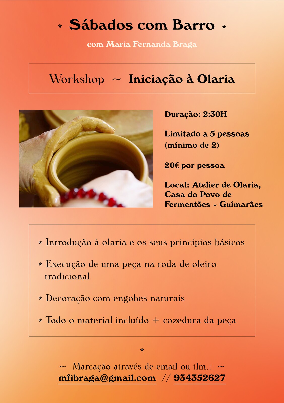 Este workshop transporta-nos para a magia da roda do oleiro, que transforma subtis movimentos de mãos em mil formas, criadas a partir de um simples pedaço de barro. No final, a peça criada irá secar para posterior cozedura.