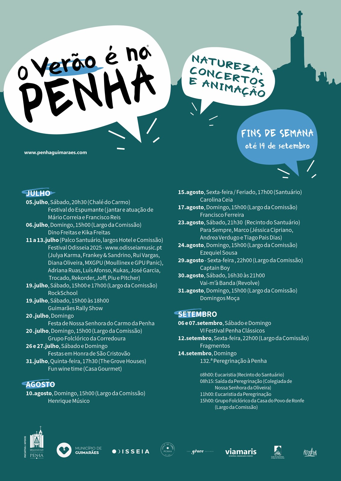Artistas como Julya Karma, Frankey & Sandrino, Rui Vargas, Diana Oliveira, MXGPU (Moullinex e GPU Panic), entre outros, integram o cartaz, num ambiente pensado de forma sustentável, com acessos facilitados por teleférico e transportes elétricos. A programação contempla ainda uma forte presença de artistas vimaranenses, como Fragmentos, Captain Boy, Carolina Ceia, Dino e Kika Freitas, Francisco Ferreira e Ezequiel Sousa, jovens talentos da RockSchool, grupos folclóricos tradicionais como os da Corredoura e da Casa do Povo de Ronfe, além de outros eventos marcantes como o Festival do Espumante, sunsets nos jardins da The Grove Houses, o Guimarães Rally Show, o Vai-m’à Banda (Revolve) e o Festival Penha Clássicos. O calendário religioso integra celebrações emblemáticas como a Festa de Nossa Senhora do Carmo, as Festas em Honra de São Cristóvão e a 132.ª Peregrinação à Penha. Aos domingos, haverá animações de cariz popular, pensadas para promover o convívio e o lazer na montanha. “O Verão é na Penha 2025” decorre até 14 de setembro e reforça a Penha como um território de encontro, criação e celebração cultural.