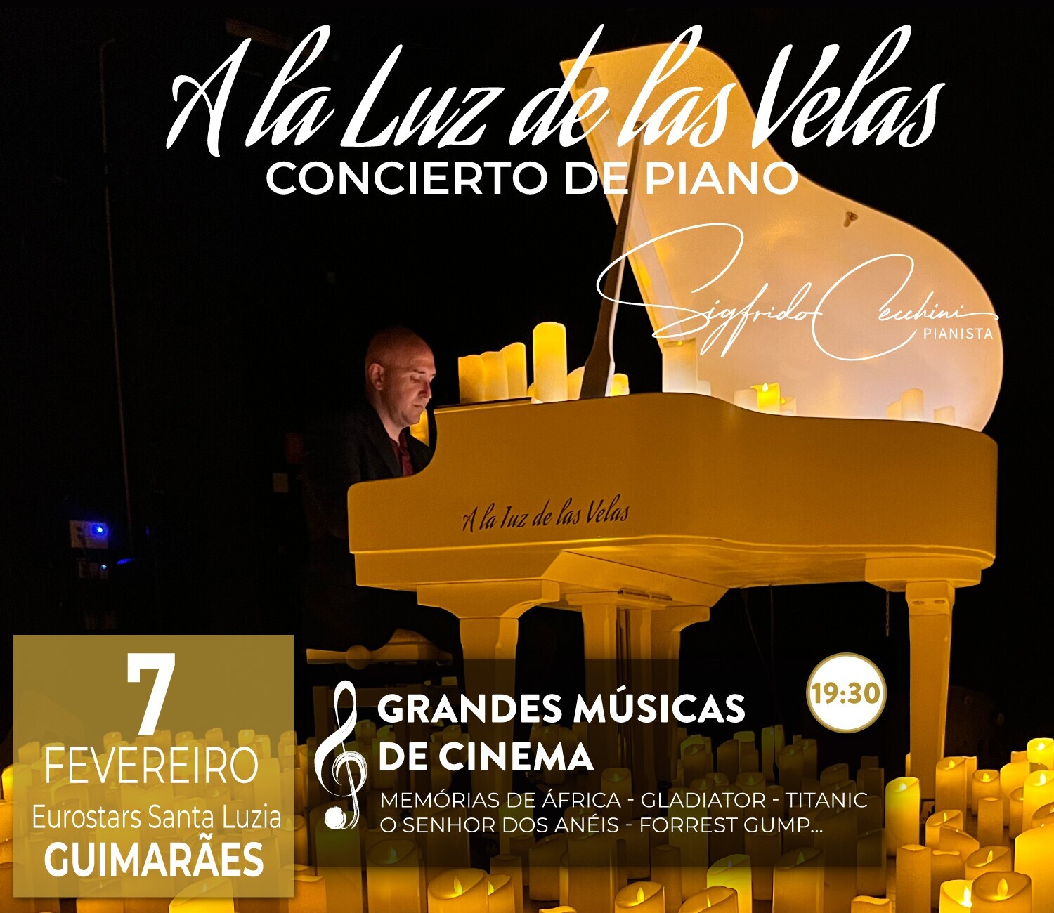 No sábado, 7 de fevereiro de 2026, às 19h30, a luz quente e cintilante de 1.500 velas transformará este espaço elegante num cenário íntimo e emocionante, onde as grandes bandas sonoras da sétima arte ganharão nova vida. O pianista Sigfrido Cecchini, com a sua sensibilidade e virtuosismo, interpretará um repertório cuidadosamente escolhido que o fará reviver as cenas mais marcantes da grande tela. Da força épica de Gladiator à ternura de Titanic, passando pela poesia de Intocáveis e pela fantasia de O Senhor dos Anéis, cada nota será um convite para sentir, sonhar e recordar.