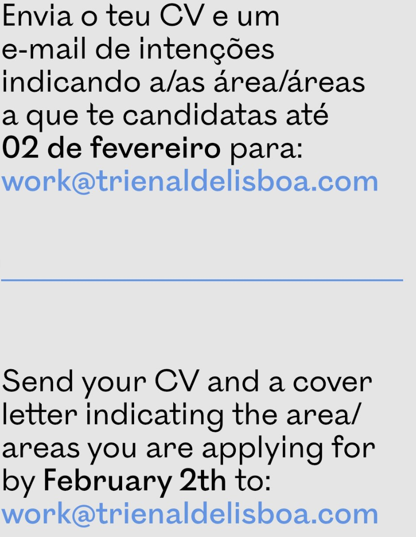 Se tens interesse, envia o teu CV e e-mail de intenções até 02 de fevereiro para work@trienaldelisboa.com