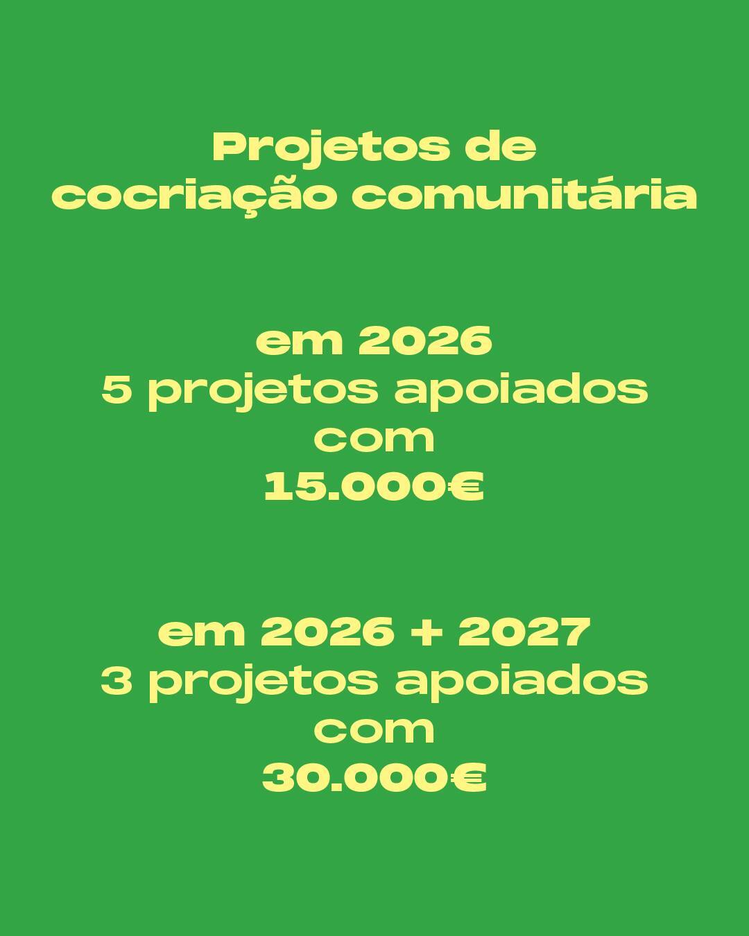 São aceites candidaturas para três modalidades — sendo que este ano foi introduzido um novo formato que contempla apoio a projetos de cocriação comunitária para os anos de 2026 e 2027, assinalando um compromisso continuado ao longo deste biénio.