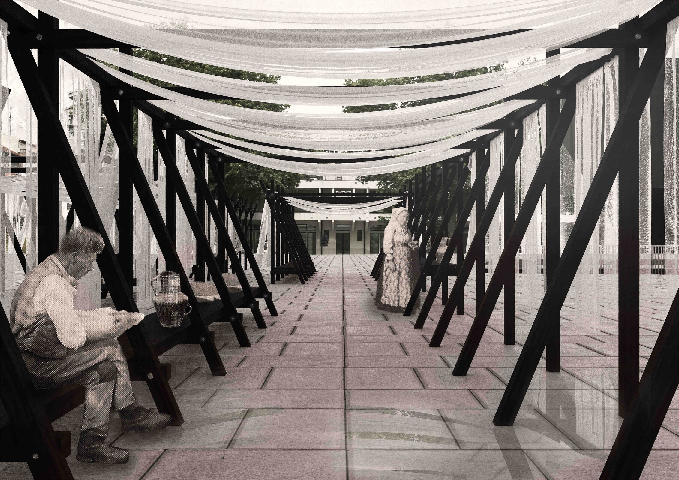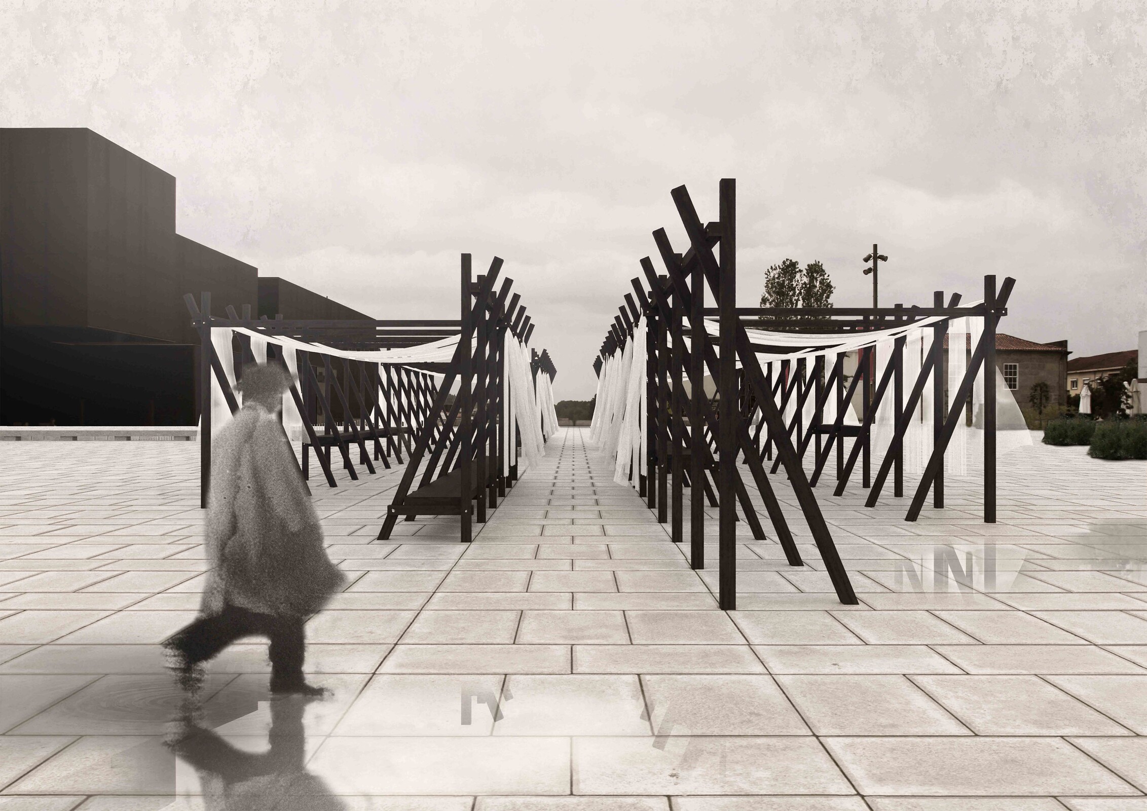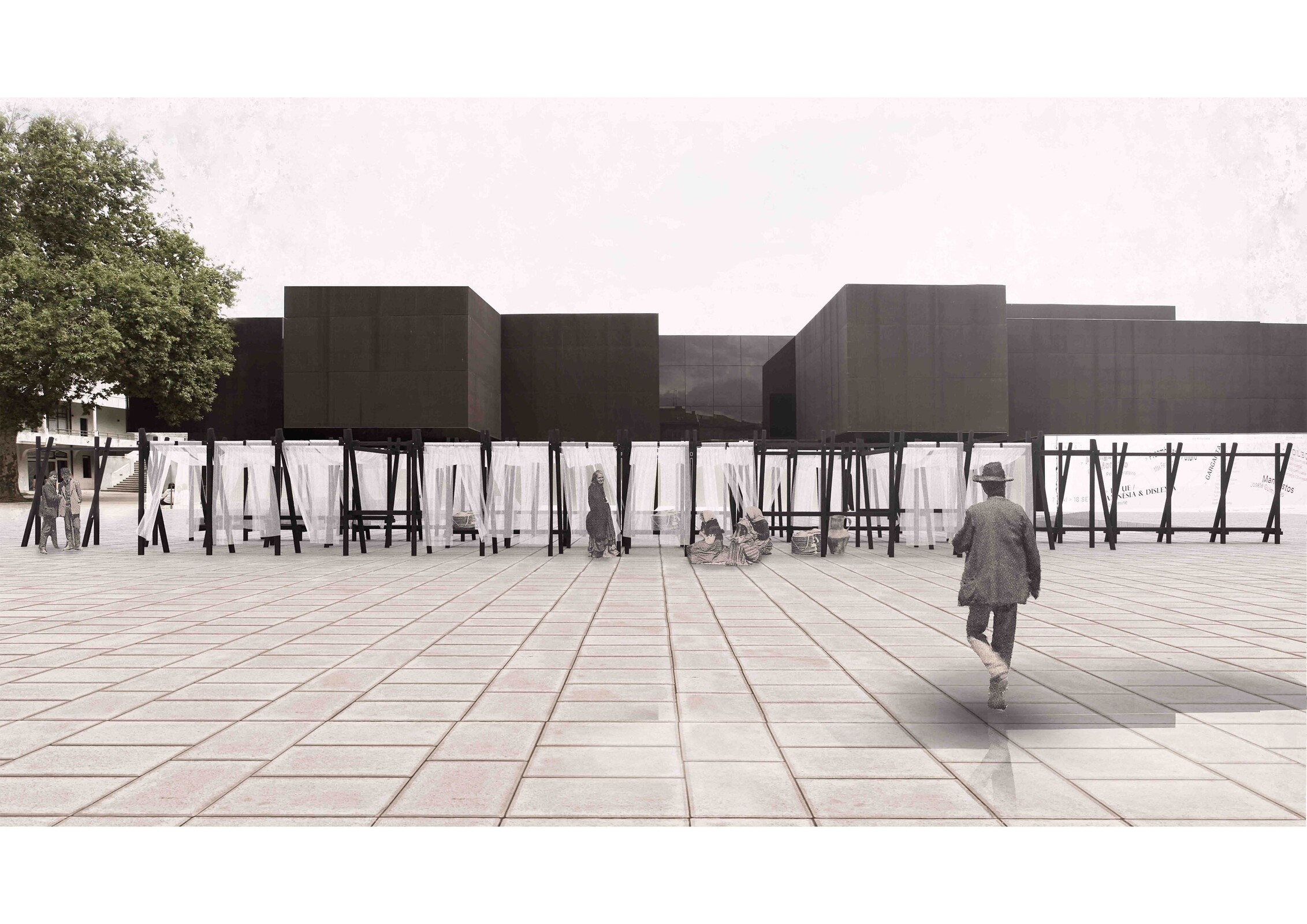 “Fórum” é um projeto arquitetónico de carácter artístico, que se fundamenta na imersão com a memória do lugar do antigo Mercado. Posicionada longitudinalmente sobre a praça, esta estrutura de barrotes de madeira queimada justapostos, capaz de formular nos seus travamentos três usos — banco; mesa de refeição ou venda; e mesa alta — envolverá os transeuntes num espaço imersivo, através da criação de uma nova ideia de paisagem que desenha novos percursos, como um palco de conversas, permanências e um lugar de comensalidade. No sistema soltam-se têxteis, que se assemelham aos toldos do antigo Mercado e ajudam a configurar as possibilidades de ocupação dos vazios. É um novo espaço de encontro que devolve ao lugar o seu significado.